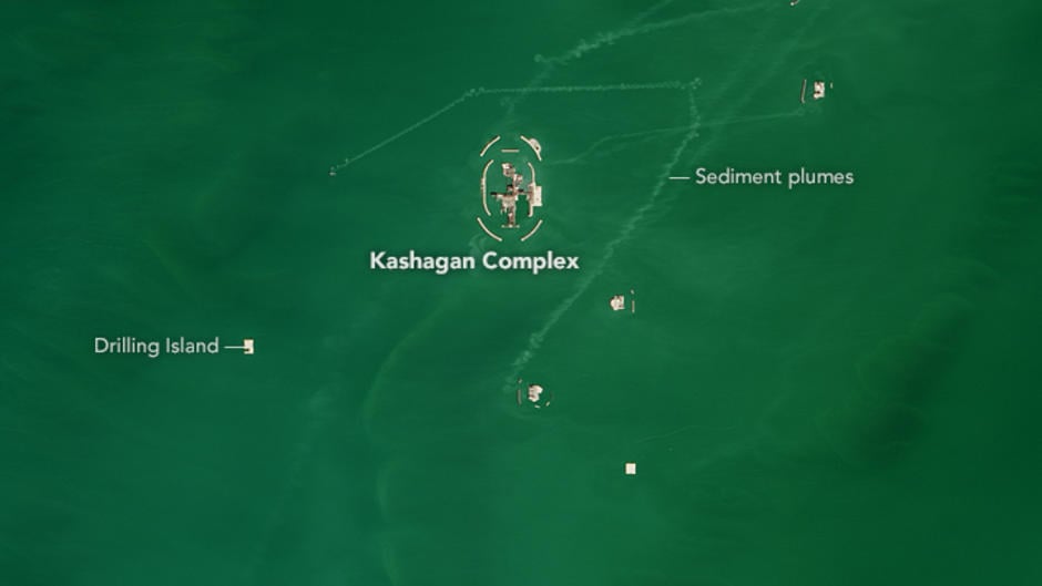 Kazakhstan's Kashagan oil and gas field in the Caspian Sea is one of the most promising in the world. However, operations are far from straightforward as the shallow waters are frozen for half of the year. Artificial islands – the small white dots in this satellite image – connected to a central complex had to be constructed to support the equipment. The sediment plumes seen in the image are created by underwater currents.