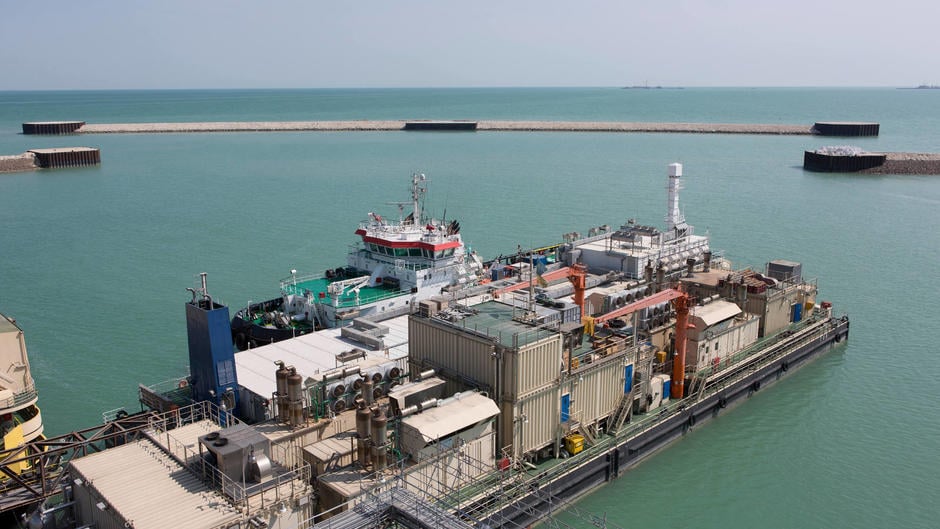 Oil and gas are produced on Kashagan's artificial islands (such as the one shown in this photograph) then delivered to the central complex. Pipelines transport the oil and gas to the shore where the vast Bolashak processing plant has been constructed. The plant purifies the oil for exportation and removes the sulfide from the natural gas.