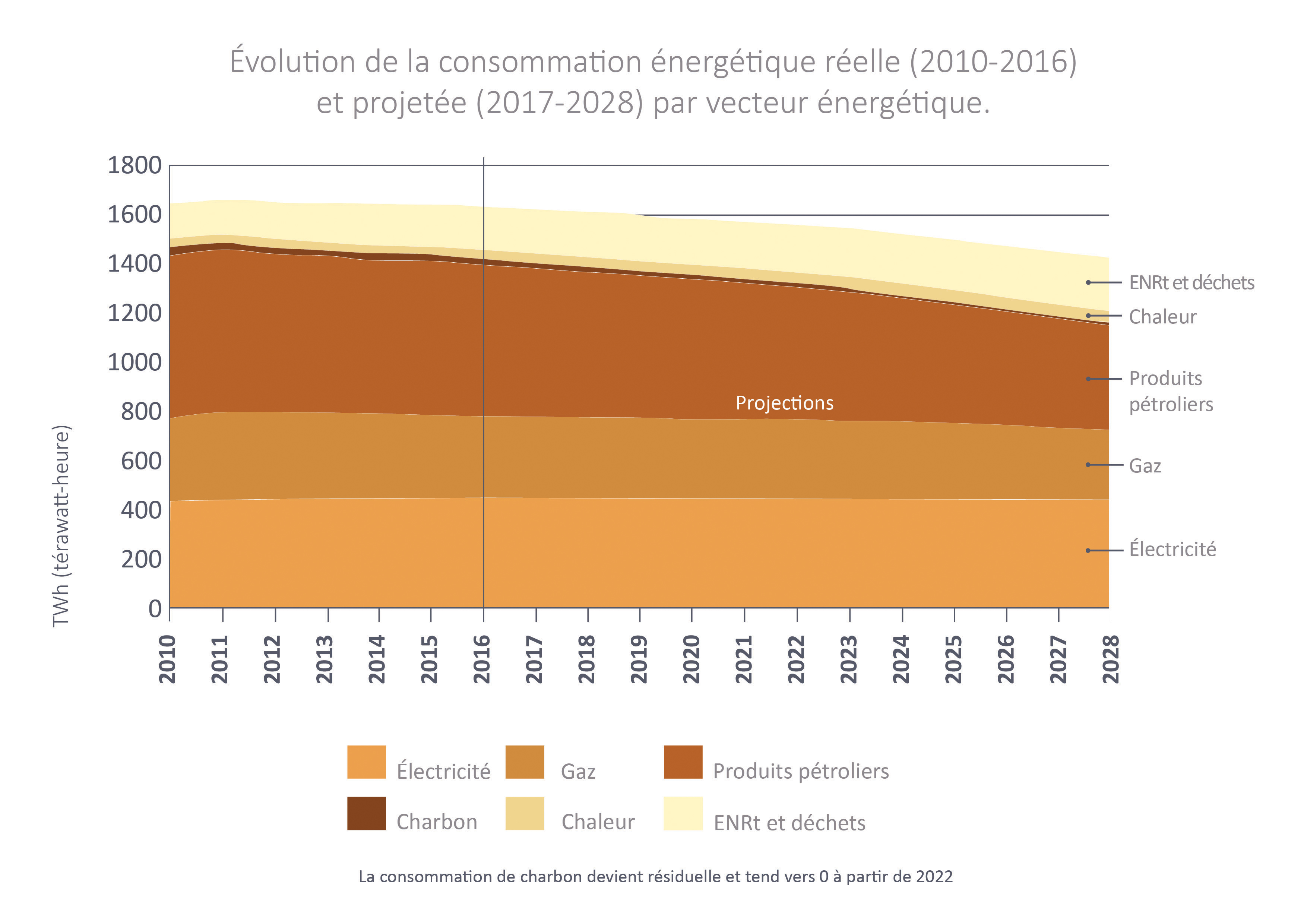 - La PPE fixe deux paliers : -20 % de fossiles (produits pétroliers, gaz naturel, charbon) en 2023 et -35 % en 2028 (comparé à 2012).