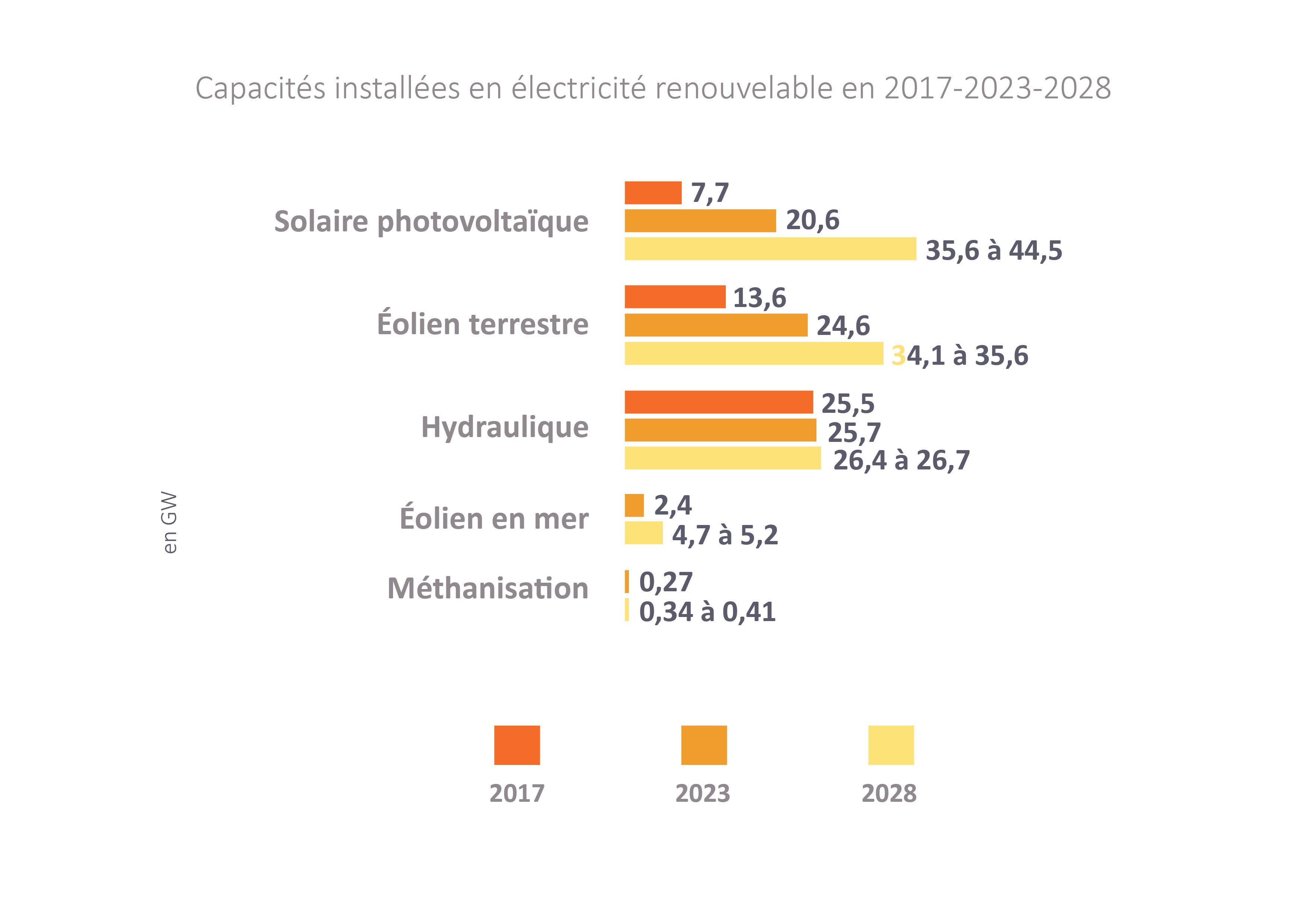 - À l’horizon 2030, la production du parc éolien terrestre sera triplée (8 000 mâts fin 2018, sans doute près de 15000 en 2028).