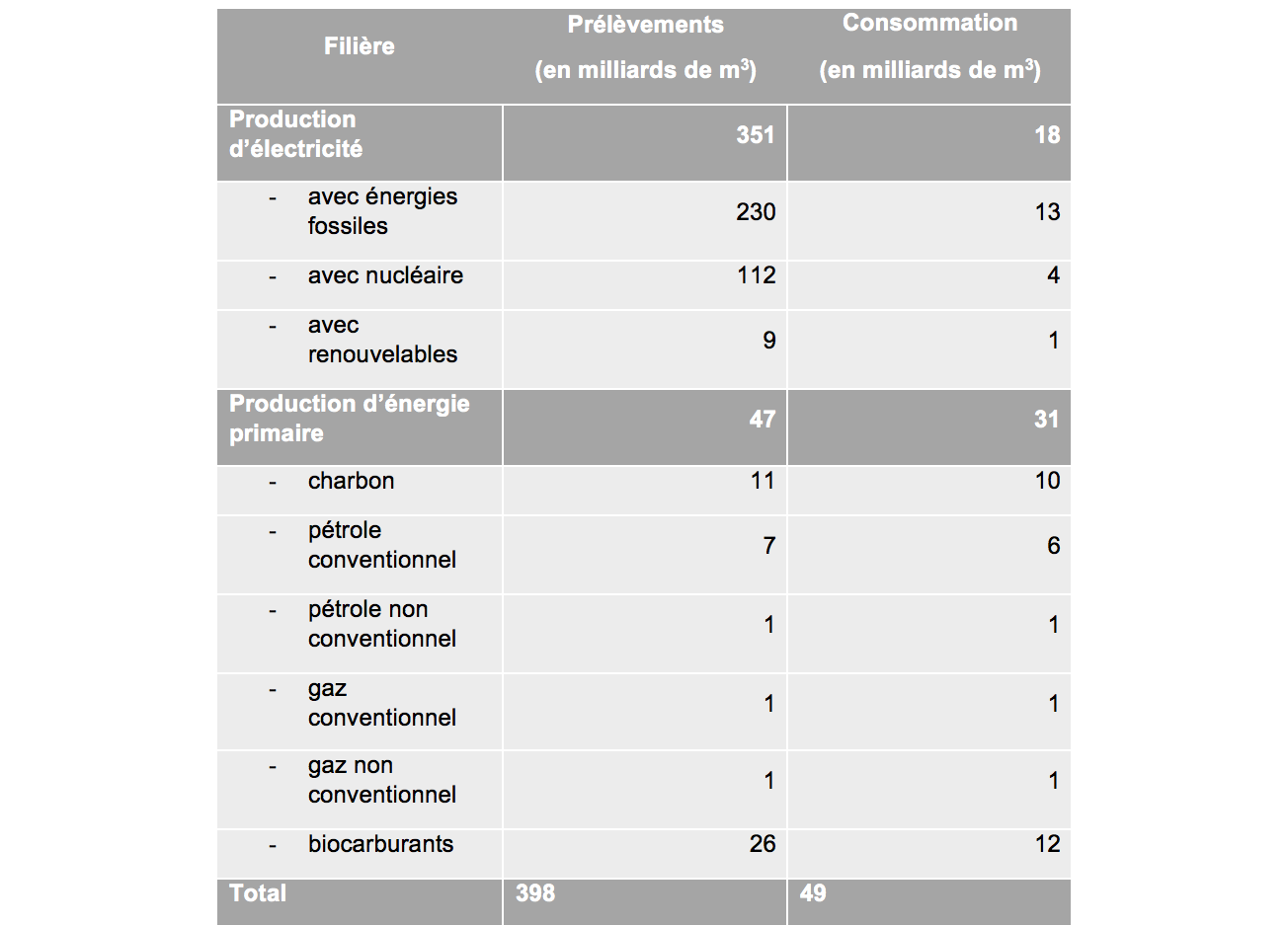 La production des (charbon, pétrole, gaz, biocarburants) prélève des quantités plus modestes (moins de 60 milliards de m3) mais en restitue moins de la moitié. Au total, donc, elle « consomme » plus que la production d’électricité.