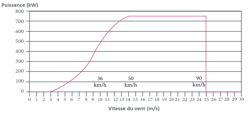 Prenons l’exemple d’une éolienne de 0,75 MW. Un tel modèle a un mât d’environ 75 mètres et un rotor de 40 mètres de diamètre. Quand le vent dépasse 50 km/h environ, la puissance délivrée n’augmente plus. Si le vent atteint des vitesses qui deviennent dangereuses (autour de 90 km/h), l’éolienne est mise à l’arrêt par sécurité. La puissance tombe donc à zéro d’un seul coup.