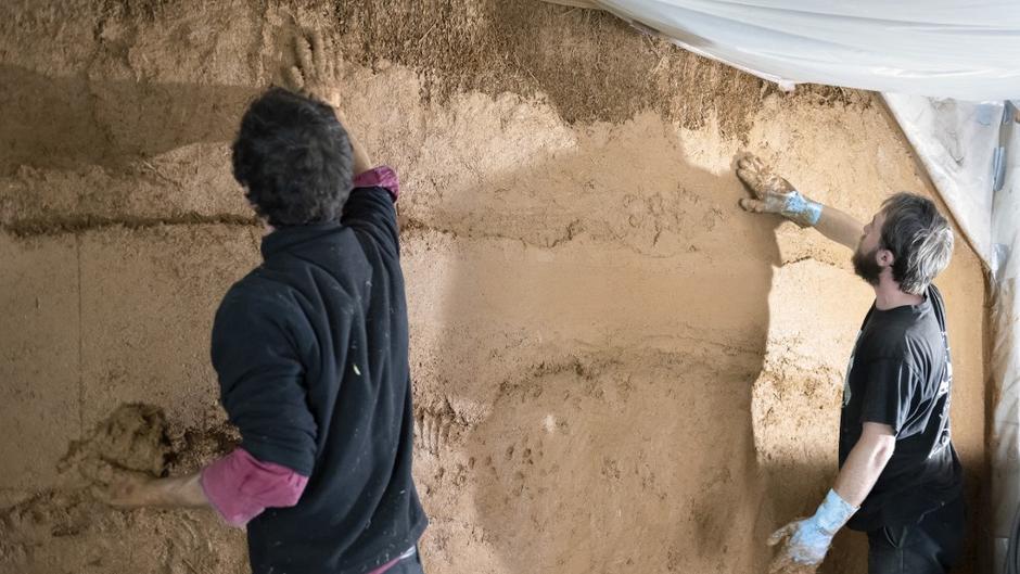 En plus des efforts du gouvernement et des entreprises, les citoyens contribuent également à la transition vers des énergies plus propres. Ils peuvent le faire en consommant moins et en prêtant attention aux innovations disponibles. Pour les maisons, il existe de nouvelles technologies qui utilisent des matériaux naturels, locaux et recyclables. L’image illustre un travailleur construisant un mur avec de la paille et du torchis, intégré dans une structure en bois.