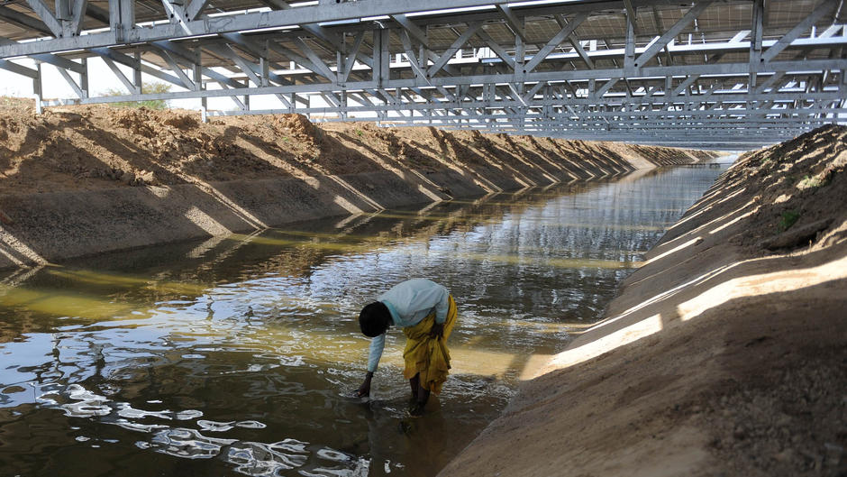 À Chandrasan, dans l’État du Gujarat, dans l’ouest de l’Inde, un canal d’irrigation a été couvert sur une portion de 750 mètres par une structure de panneaux photovoltaïques. Double avantage : le système a une capacité de production d’ d’1 MW et il limite l’évaporation dans cette région très chaude. Chaque année, 9 millions de litres d’eau sont économisés.