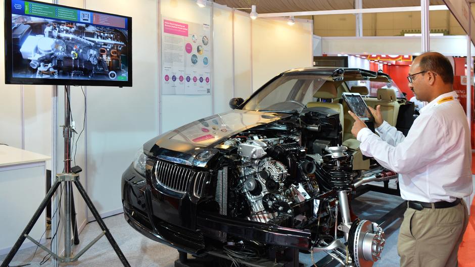 Si le sous-développement affecte de nombreuses régions, l’Inde est aussi un grand pays technologique. Les entreprises numériques sont innombrables et le pays est un grand fournisseur de logiciels et de traitement de données pour le monde entier. Sur la photo, un ingénieur examine un moteur de voiture en ayant recours à la réalité augmentée, au cours d’un des grands salons mondiaux, le ITE Biz Information Technology de Bangalore.