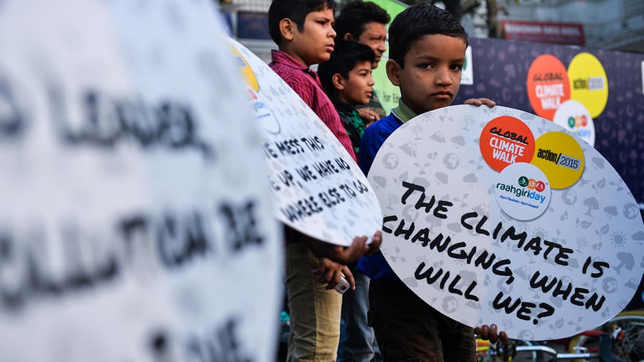 Lors d’une marche pour le climat à New Delhi, à la veille de l’ouverture de la COP21 en décembre 2015, un jeune Indien tient une pancarte en forme d’appel : « le climat change, quand changerons-nous ? ». L’Inde sera dans quelques années le pays le plus peuplé du monde, devant la Chine. Elle dépend encore très largement du charbon mais ses dirigeants ont engagé d’ambitieux programmes d’ .