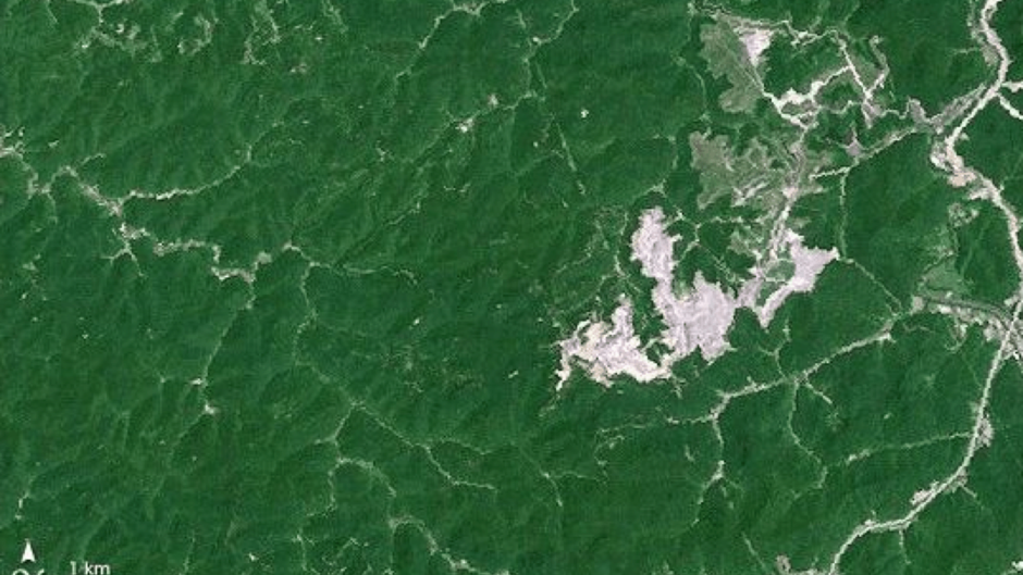 Quinze ans plus tard, l’exploitation s’est déplacée vers l’ouest et sa superficie (la zone blanche) s’est clairement étendue. En revanche, lorsque le charbon a été extrait, la mine à ciel ouvert est abandonnée et le terrain est reboisé. La zone en gris clair correspond à ces surfaces où la forêt repousse lentement… en ayant perdu un peu d’altitude.