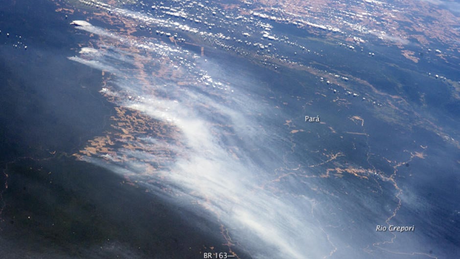 Puits naturel de carbone, la forêt est un patrimoine menacé. Dans la forêt amazonienne, des feux sont allumés par les agriculteurs pour s’assurer de nouvelles terres à exploiter. De longs panaches de fumées s’en échappent. Les zones bruns rouges sur la photo montrent les terres déjà cultivées qui se détachent de la couleur sombre de la forêt équatoriale.