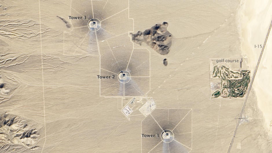 Près de 350 000 miroirs contrôlés par des ordinateurs suivent le mouvement du soleil pour obtenir le meilleur rendement possible. Les rayons solaires sont concentrés pour produire de la vapeur qui fait tourner des turbines, lesquelles produisent de l’ .
