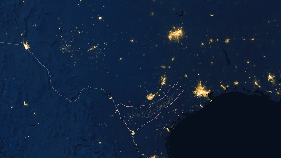 À droite du Rio Grande, en dessous de San Antonio et Austin, et à gauche de Houston, la zone délimitée en pointillés, appelée Eagle Ford Shale (600 km sur 80), est celle de l’exploitation des pétroles et du Texas. Au début des années 2000, c’était une zone déserte. Aujourd’hui, les cités « champignons » ont surgi de terre, avec une population passée de 4 000 à 10 000 habitants.