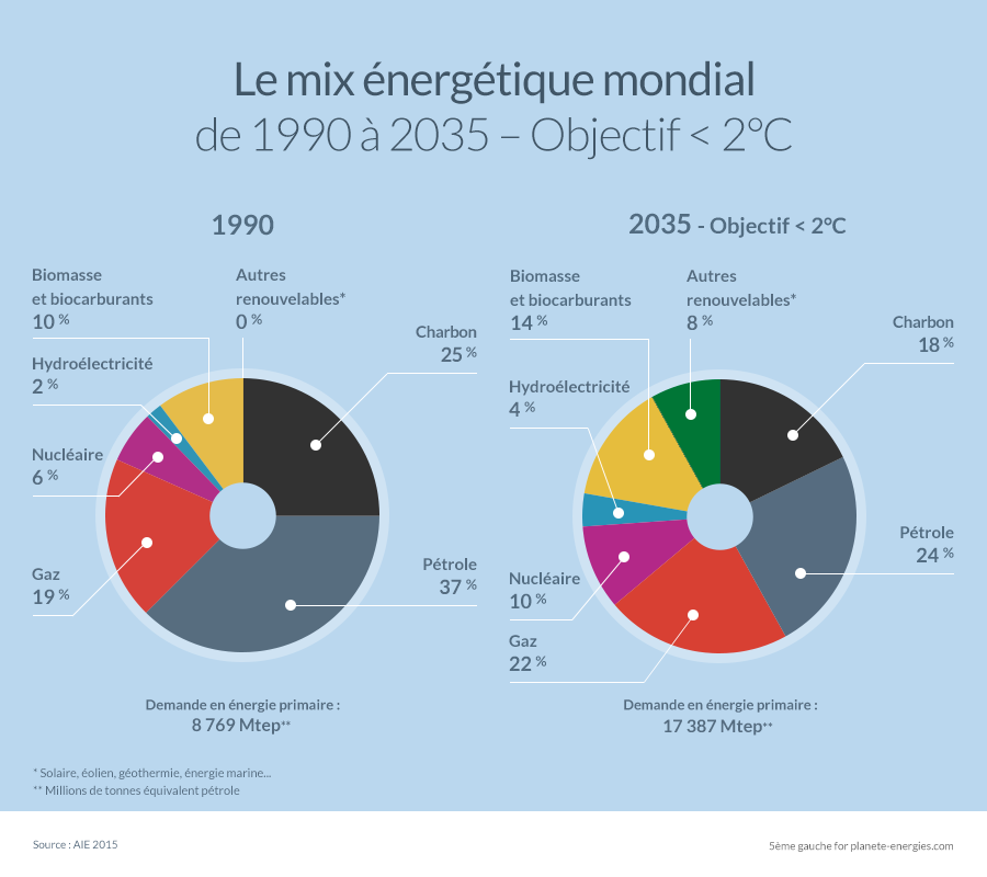 Pour atteindre cet objectif ambitieux, il faut d’abord réduire la demande globale d’énergie de 632 à 541 exajoules, malgré l’augmentation de la population et des besoins. Cela implique de consommer moins et mieux l’énergie. Ensuite, il faut changer la composition du mondial, en passant des énergies fossiles (pétrole, gaz, charbon) aux (solaire, éolien, hydroélectricité, etc.). Les énergies fossiles doivent passer de 80 % à 17 % de la production totale, tandis que les énergies renouvelables doivent passer de 12 % à 71 %.