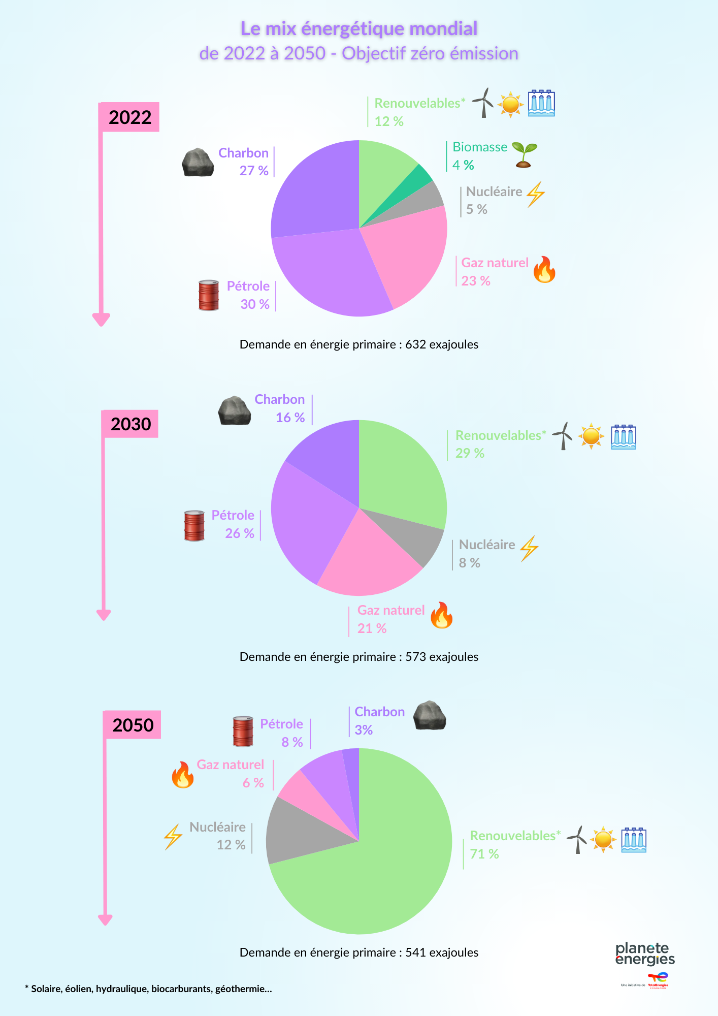 Pour atteindre cet objectif ambitieux, il faut d’abord réduire la demande globale d’énergie de 632 à 541 exajoules, malgré l’augmentation de la population et des besoins. Cela implique de consommer moins et mieux l’énergie. Ensuite, il faut changer la composition du mondial, en passant des énergies fossiles (pétrole, gaz, charbon) aux (solaire, éolien, hydroélectricité, etc.). Les énergies fossiles doivent passer de 80 % à 17 % de la production totale, tandis que les énergies renouvelables doivent passer de 12 % à 71 %.
