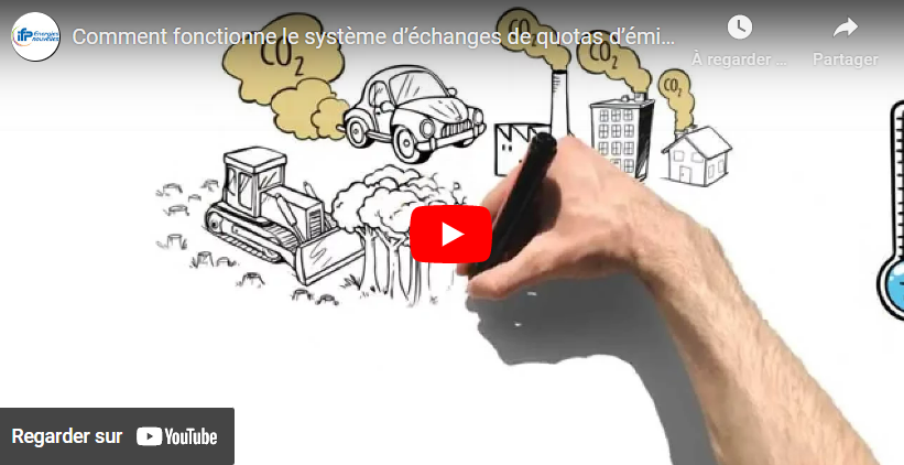 L’Union européenne a été la première zone mondiale à instaurer en 2005 un marché de « quotas carbone » qui est aujourd’hui encore le plus grand. Le marché européen du carbone couvre près de 50 % des émissions de CO2 en Europe. Complexe de prime abord, son fonctionnement est ici expliqué en quelques dessins. Une vidéo réalisée en commun par IFP-Énergies nouvelles, l’ADEME et CDC-Climat-Recherche.